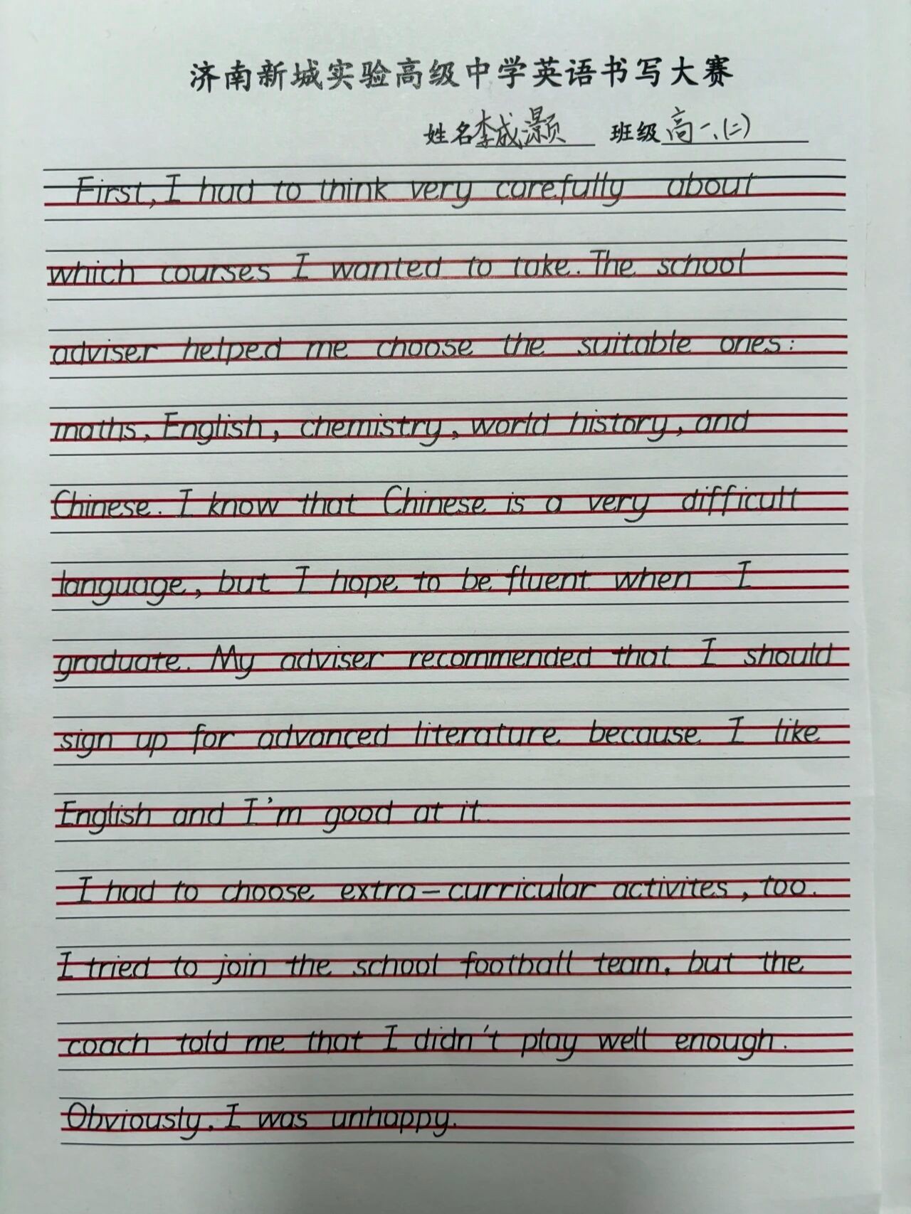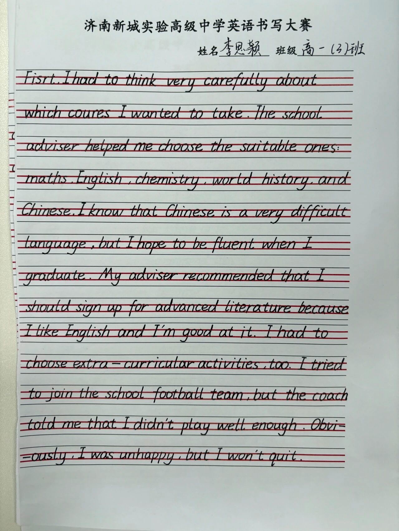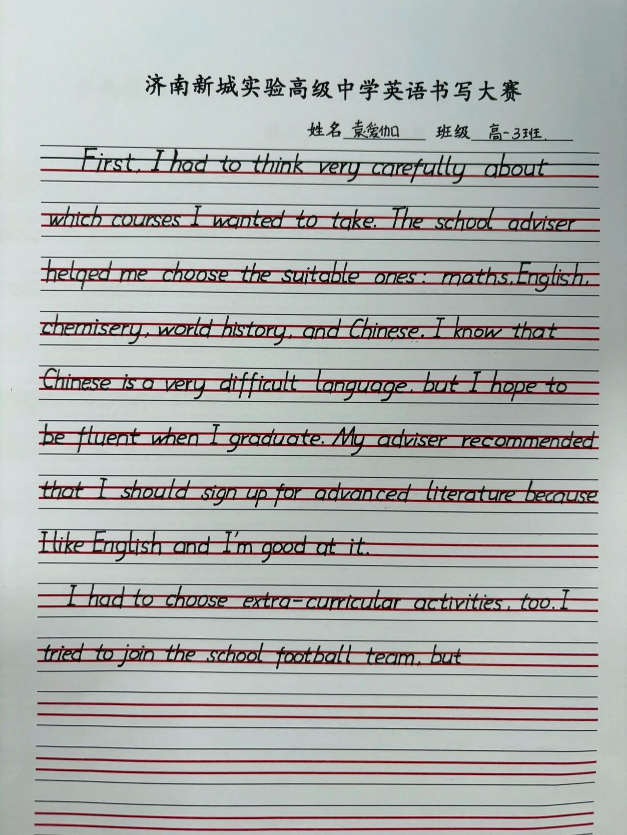 由学校高一英语教师组成的评委团持着公平、公正、公开的原则,认真审视每一份作品,从“书写规范、卷面整洁、整体美感”三个主要方面,严格评选,最终获奖学生如下: