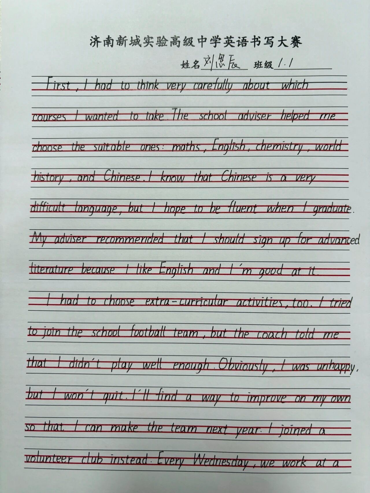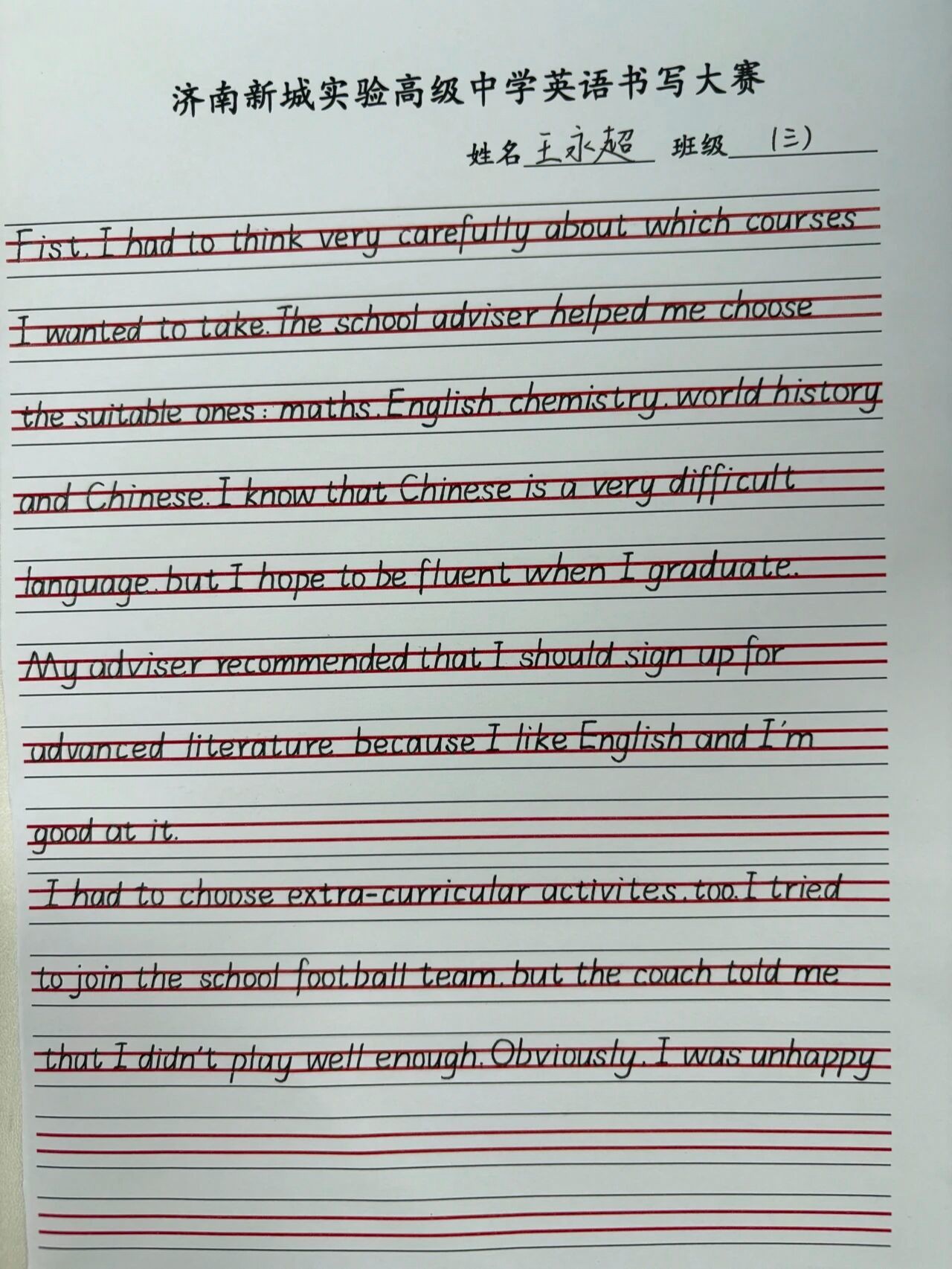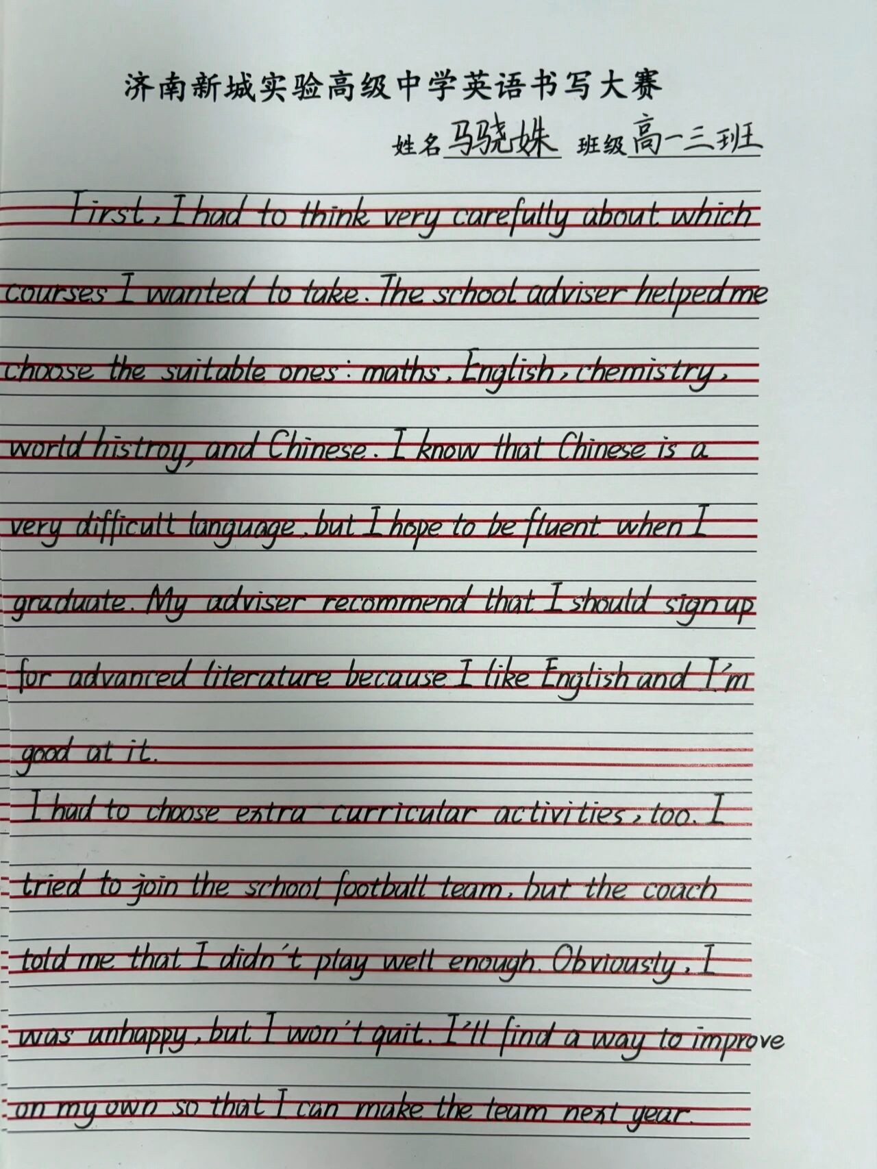 由学校高一英语教师组成的评委团持着公平、公正、公开的原则,认真审视每一份作品,从“书写规范、卷面整洁、整体美感”三个主要方面,严格评选,最终获奖学生如下: