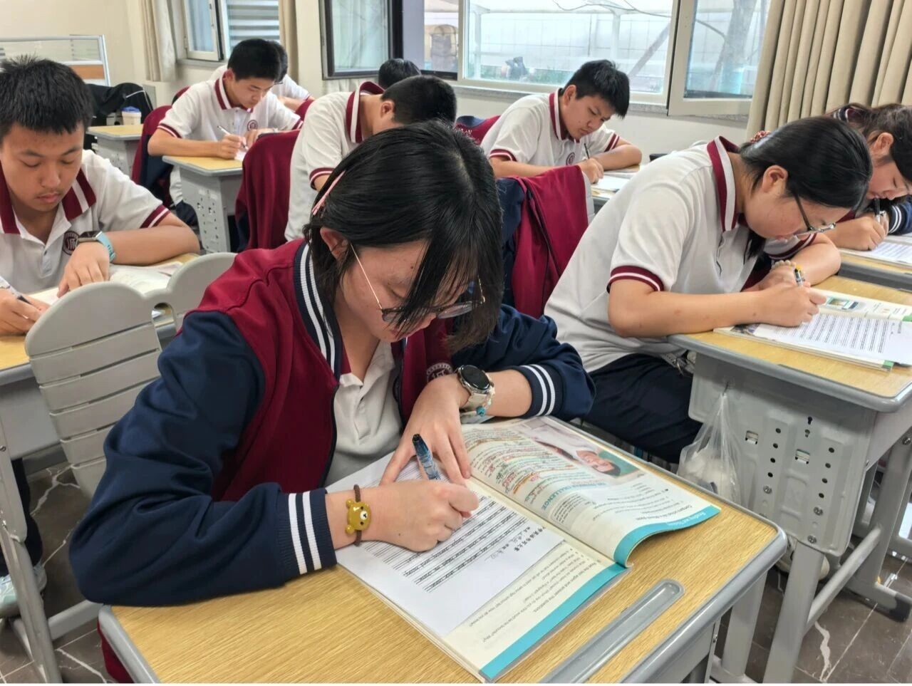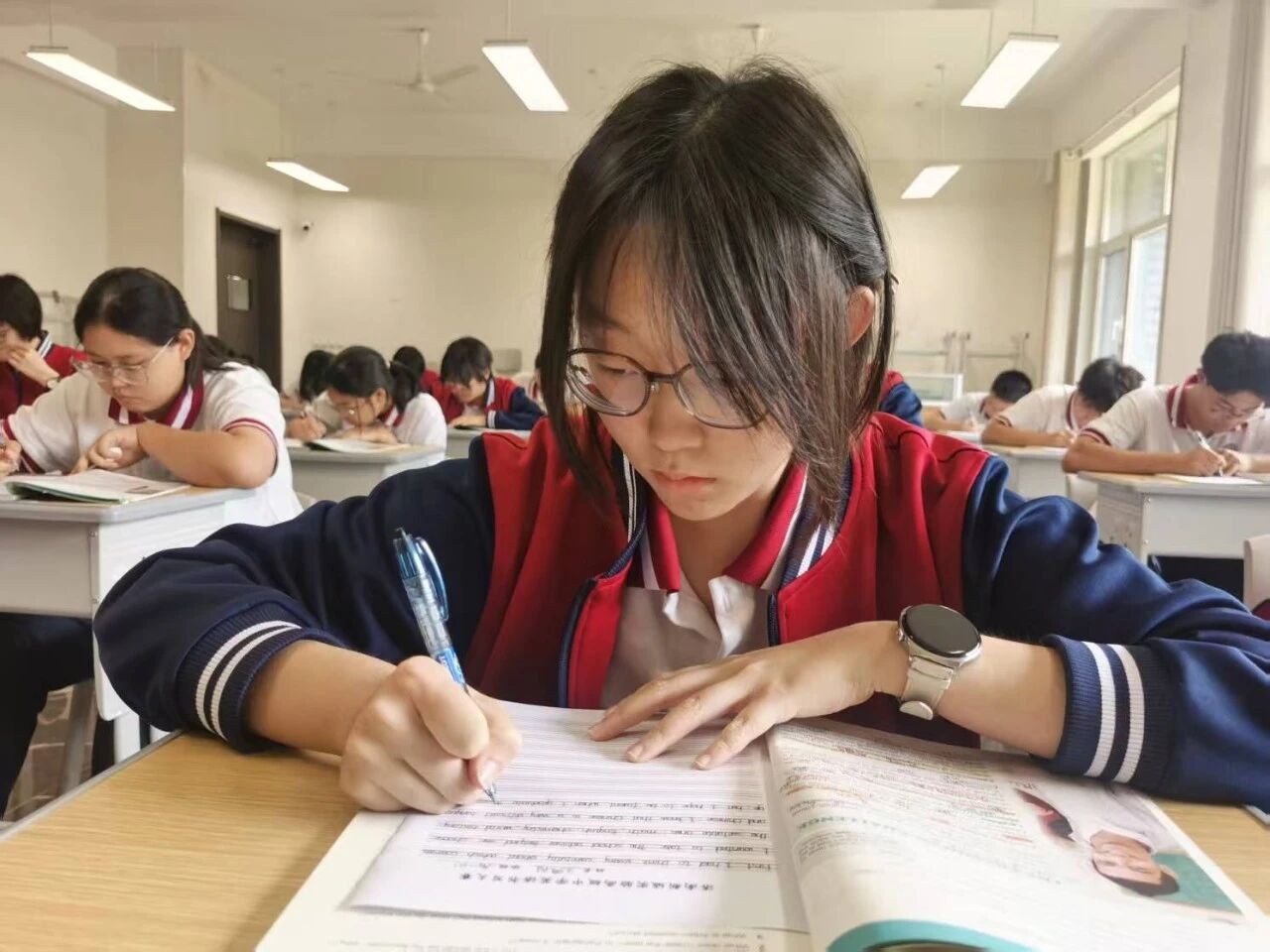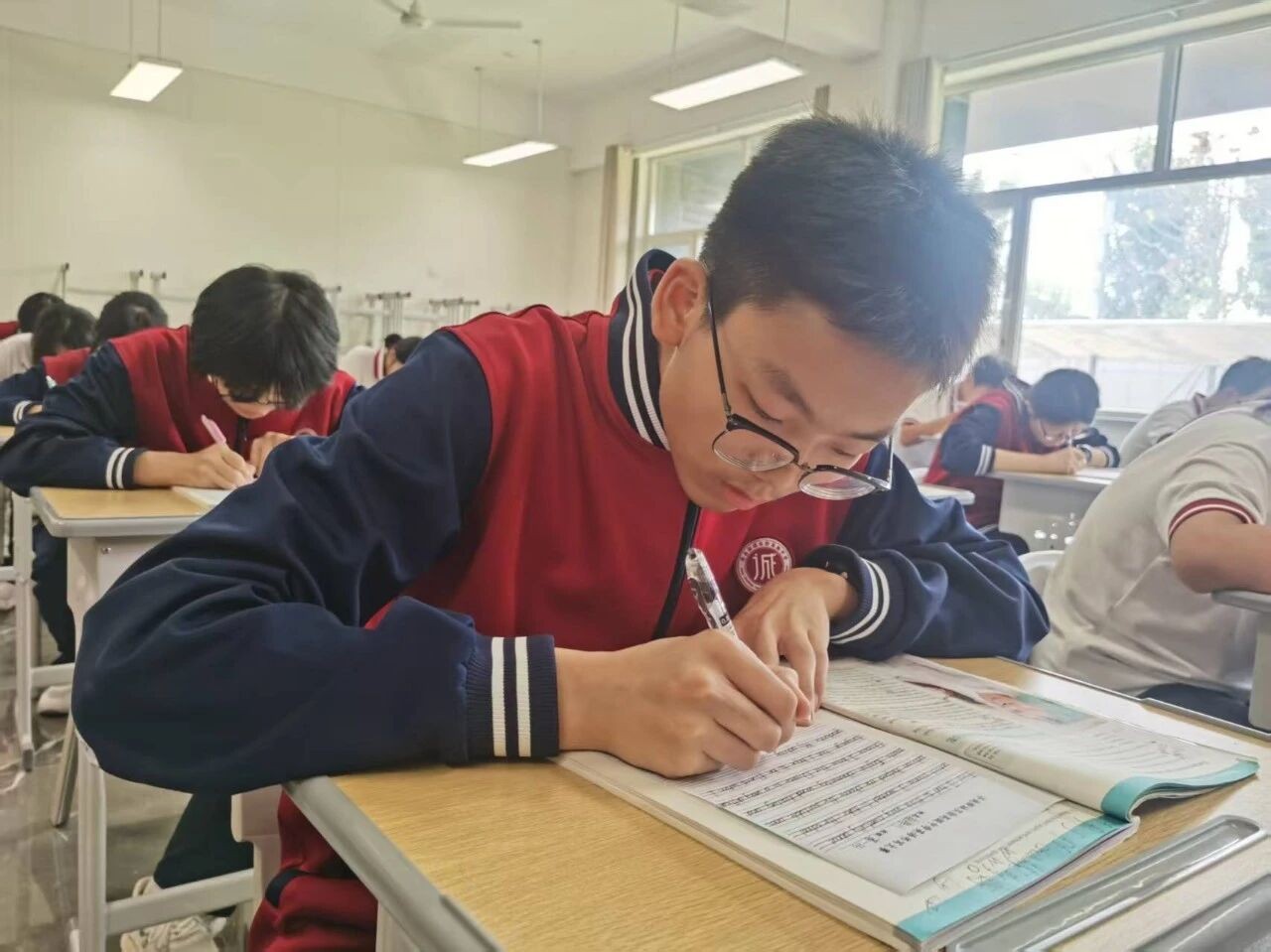 比赛现场,安静得只听得到笔尖轻触纸面发出的“沙沙”声,学子们端正坐姿,全神贯注,将对书写的严格要求倾注于每一个字母、每一个单词之中。