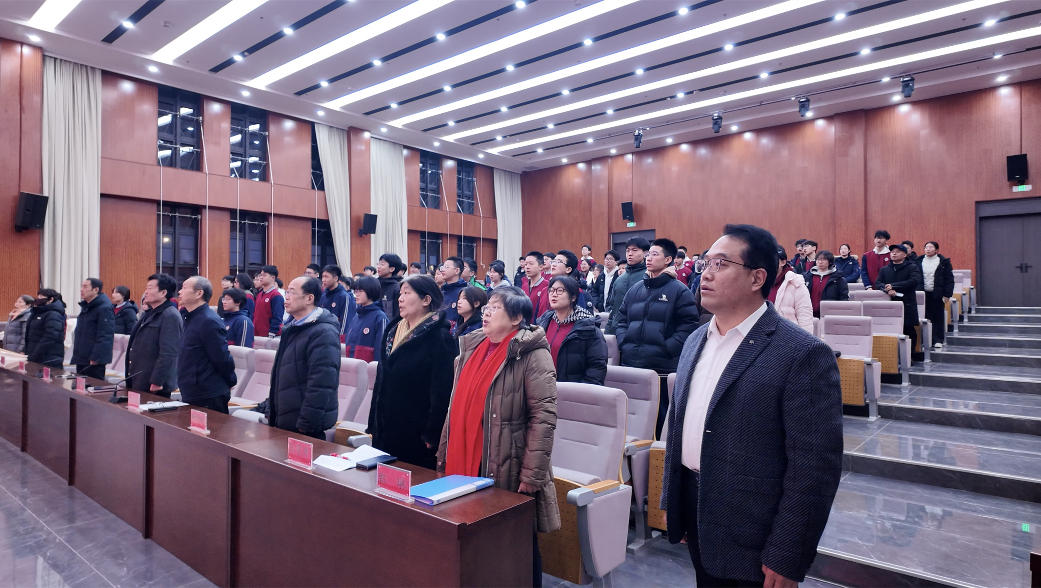 随后,全体师生肃然起立,奏唱国歌。